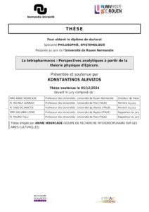 Konstantinos Alevizos soutiendra sa thèse intitulée « La tetrapharmacοs : perspectives analytiques à partir de la théorie physique d’Épicure » à l’université de Rouen Normandie le 5 décembre 2024, à 13h30.